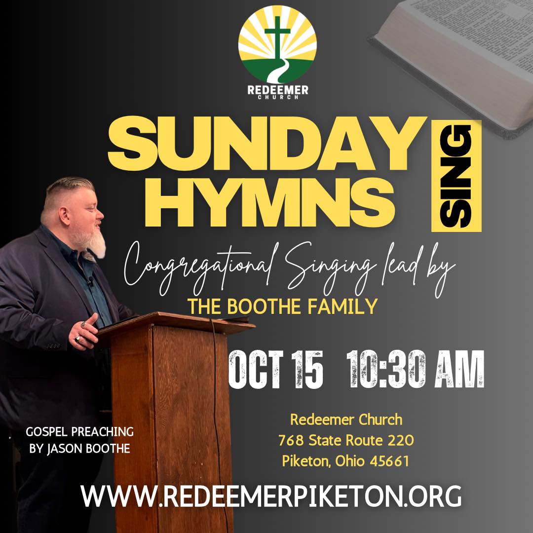This Sunday, October 15th, 2023 at 10:30 AM the Boothe Family will lead the congregation in old-fashioned hymn singing! In addition to the Sunday Hymn Sing, Jason will preach a grace-filled message. Come and start your faith walk with us this Sunday! We're going to sing some great old-time hymns this Sunday as we celebrate … Continue reading Sunday Hymn Sing This Sunday!