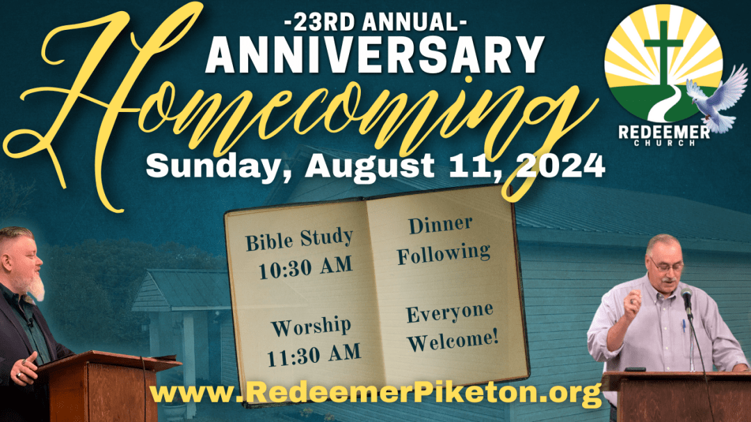You are invited to join with us on Sunday August 11, 2024 as we celebrate 23 years of the Lord's keeping hand on this ministry! By His grace, we have been able to declare the true and saving Gospel of God's Free and Sovereign Grace throughout the tri-state and beyond! Bible Study will begin at … Continue reading 23rd Homecoming Celebration