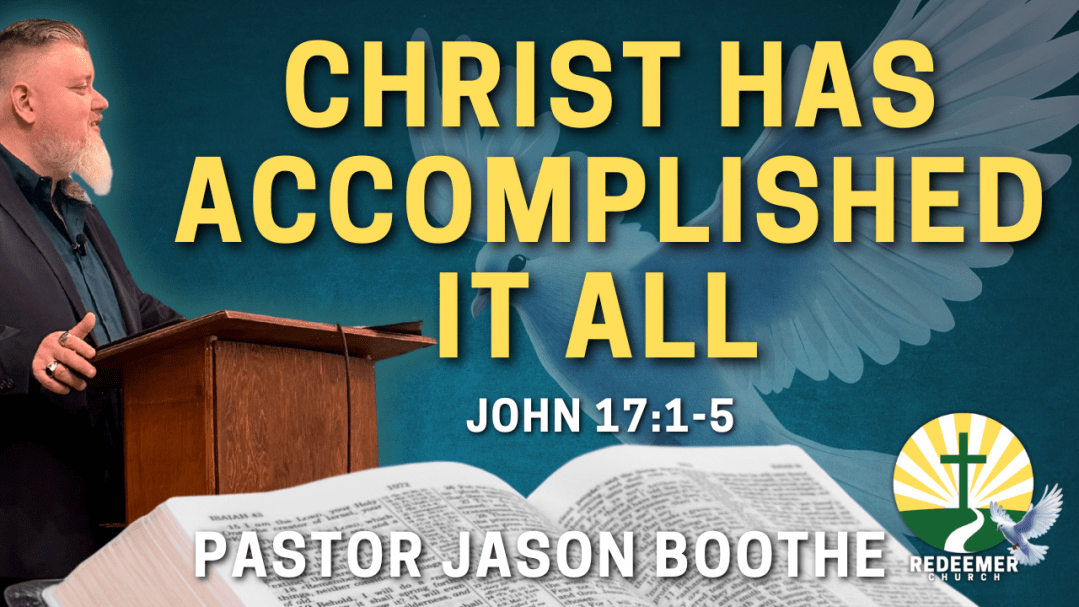 https://youtu.be/8pPpsZo4J8g?si=QuPcVjl3pkuTIWdS Pastor Jason Boothe delivers the message of Gospel Hope from the High Priestly Prayer of Christ found in John 17:1-5. Christ has accomplished everything the Father sent Him to perform. Christians can rest in the finished work of Christ alone for all righteousness!